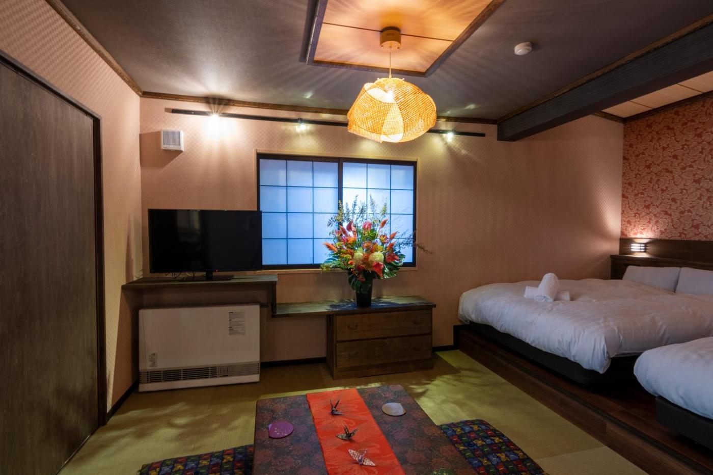 Deluxe Family Room. The spacious family room provides air conditioning, a washing machine, as well as a private bathroom featuring a shower and a bidet. Meals can be prepared in the well-fitted kitchen, which is equipped with a stovetop, a refrigerator, kitchenware and a microwave. The family room features tatami, a dining area, an electric kettle, tumble dryer, as well as a flat-screen TV. The unit offers 4 beds.