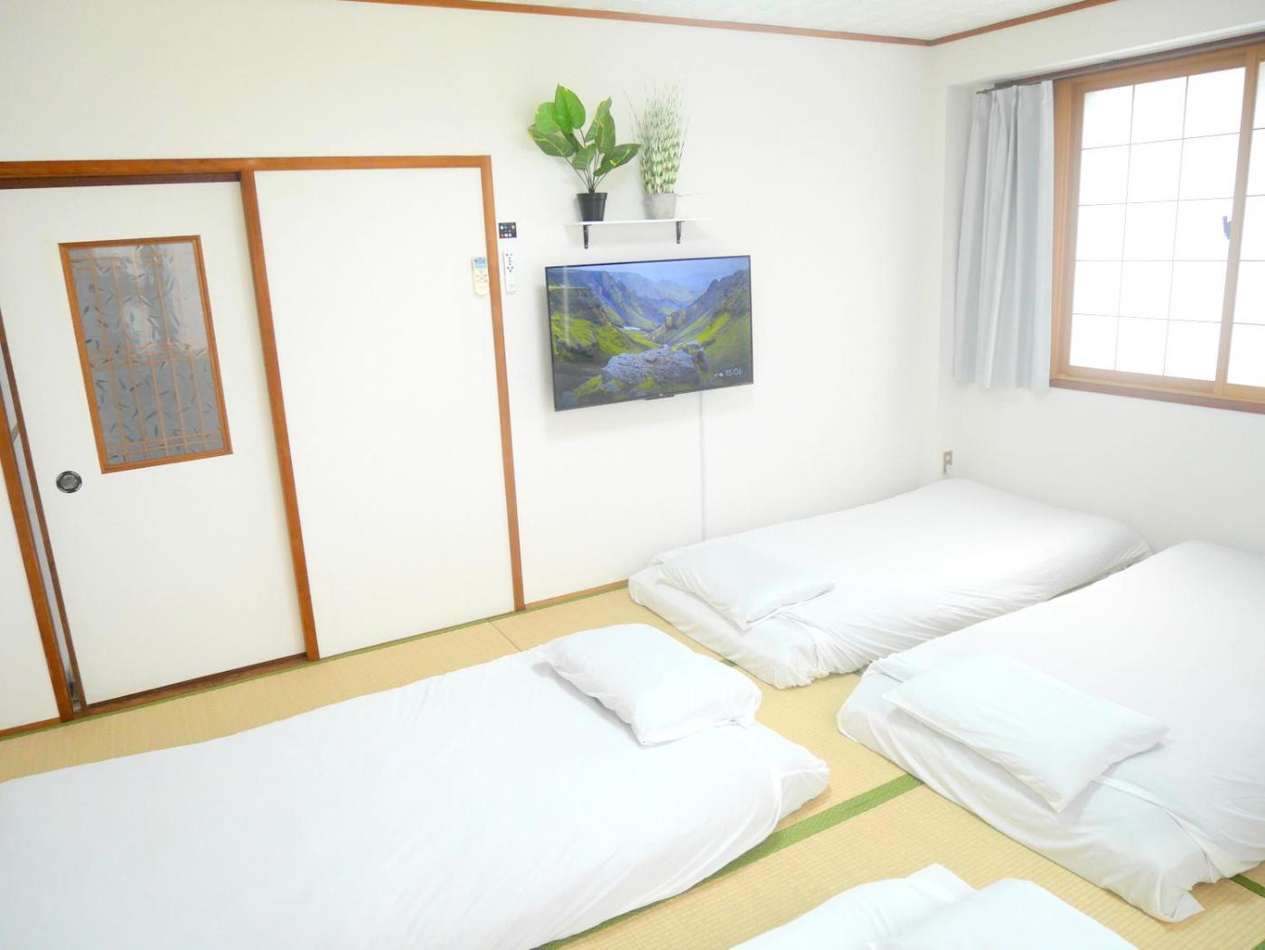 Three-Bedroom Apartment. This spacious apartment comes with 1 living room, 3 separate bedrooms and 1 bathroom with a bath and free toiletries. Guests will find a stovetop, a refrigerator, kitchenware and an oven in the kitchen. The apartment also includes a barbecue. The apartment features air conditioning, a washing machine, tatami, a tea and coffee maker, as well as a flat-screen TV with streaming services. The unit has 1 bed and 8 futons.